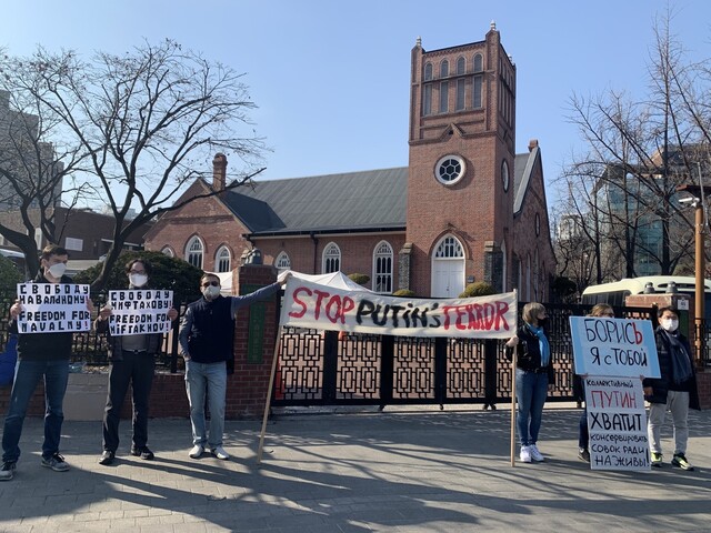 '나발니를 석방하라' '푸틴은 테러를 멈춰라' 라는 목소리를 내는 한국에 거주하는 러시아인들은 집회가 주한 러시아 대사관 근처에서 있었습니다. 이들은 블라디미르 푸틴 러시아 대통령을 비판하다 구금된 야권 인사 알렉세이 나발니의 석방을 요구하며 푸틴 대통령 규탄 집회를 열었는데요.